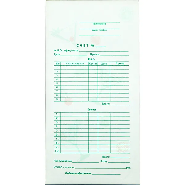 Бланк для счета «Бар,кухня» двухслойный "Коктейль" самокопир. ,H=8,L=200,B=100мм разноцветн.