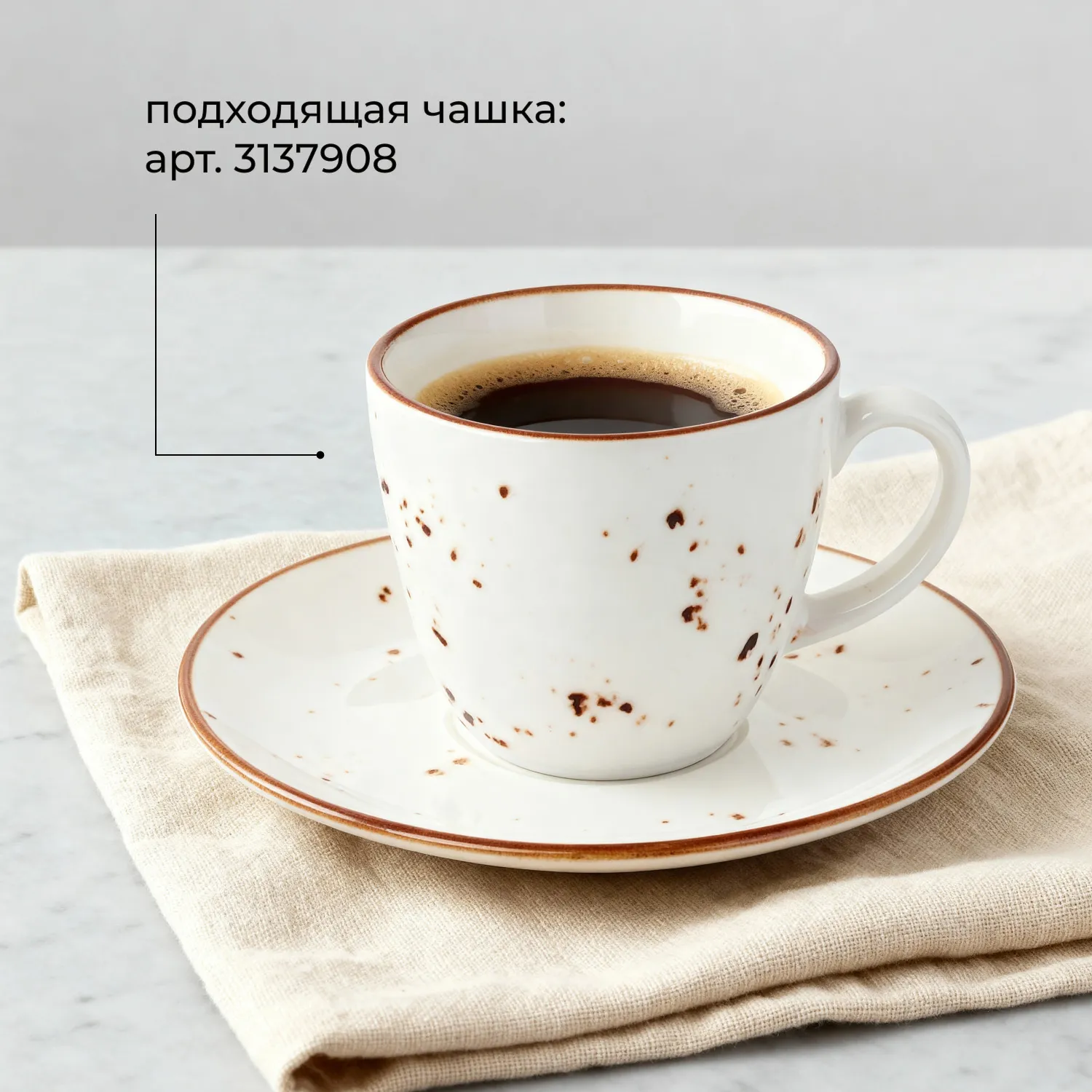 Блюдце «Париж» бренда Kunstwerk – утонченный акцент, завершающий чайную или кофейную сервировку. Изделие выполнено из прочного фарфора с нежным молочно-белым фоном, украшенным изящными коричневыми крапинками и строгим контрастным кантом. Такой дизайн придает модели индивидуальность, оставаясь частью гармоничной коллекции.