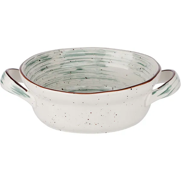 Внутренняя часть богато декорирована тонкими горизонтальными линиями зеленого цвета, которые придают изделию легкую динамичность и глубину. Ободок подчеркнут тонкой коричневой линией, добавляющей изысканности. Ручки также раскрашенные в зеленые тона, гармонируют с внутренним декором и усиливают устойчивость при переноске.