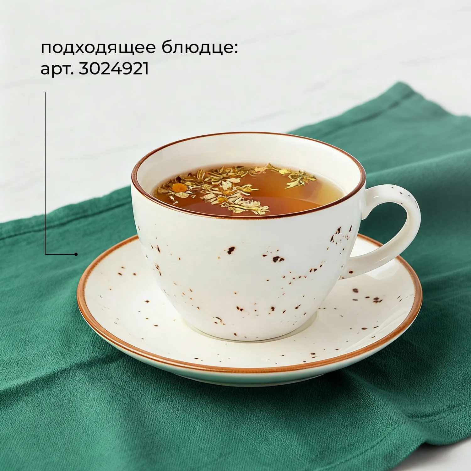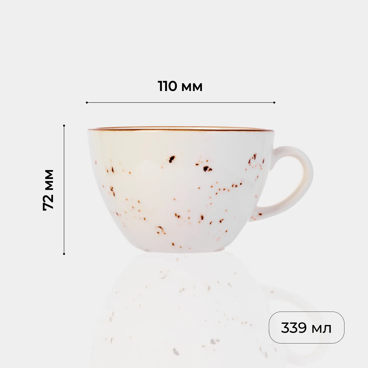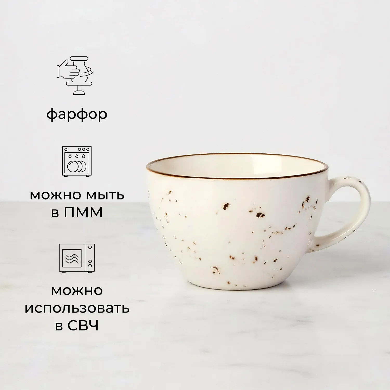 Чашка «Париж» бренда Kunstwerk – просторная и элегантная посуда для тех, кто ценит объем, стиль и комфорт. Изготовлена из фарфора с глянцевой поверхностью нежно-белого цвета, украшенной шоколадно-коричневыми крапинками и контрастным кантом. Солидный объем 339 мл и диаметр 110 мм позволяют насладиться любимым напитком в полной мере.