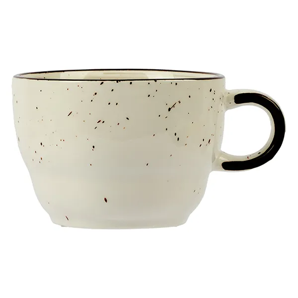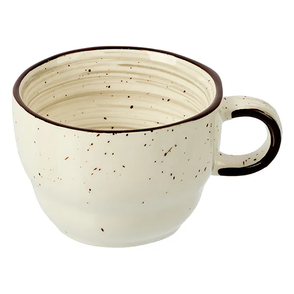 Бренд Kunstwerk известен своим высококачественным фарфором. Кроме классической белой посуды у компании есть много изделий оригинального дизайна. Чайная чашка серии «Пастораль» выполнена в сером цвете с аккуратной черной ручкой и мелкими темными точками – брызгами по всей поверхности. Она слегка расширяется кверху, имеет глянцевое покрытие, поэтому посуду легко мыть. Объем 190 мл, высота 55 мм, диаметр 85 мм. Благодаря толстым стенкам посуда из фарфора хорошо сохраняет тепло и не дает напитку быстро остывать.