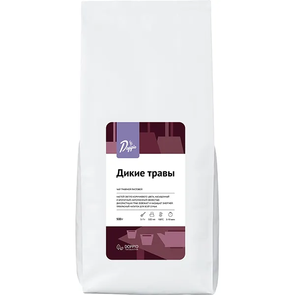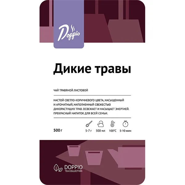 Чайная коллекция Doppio включает травяной сбор, из которого заваривается освежающий и бодрящий напиток. В его составе только натуральные ингредиенты: кусочки фруктов (папайя, груша, яблоко), ягоды брусники, ароматные травы (душица, мята, мелисса), листья и цветы (ежевика, календула, суданская роза или каркадэ). Также содержит черный чай, выращенный в экологически чистых районах.