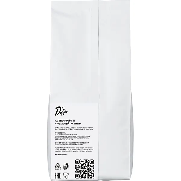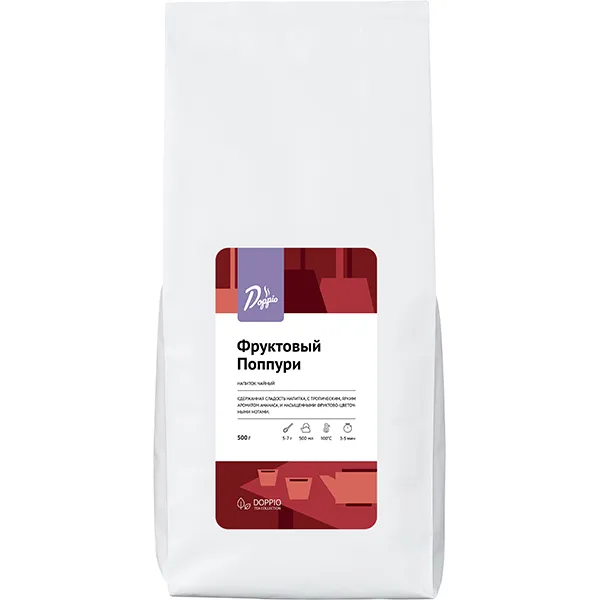 Название этого чая бренда Doppio отражает его суть и уникальный состав. Слово «поппури» происходит от французского pot-pourri, что буквально переводится как «смесь». Этим термином обозначают гармоничные сочетания, будь то ароматы, мелодии или, в данном случае, ингредиенты чая.