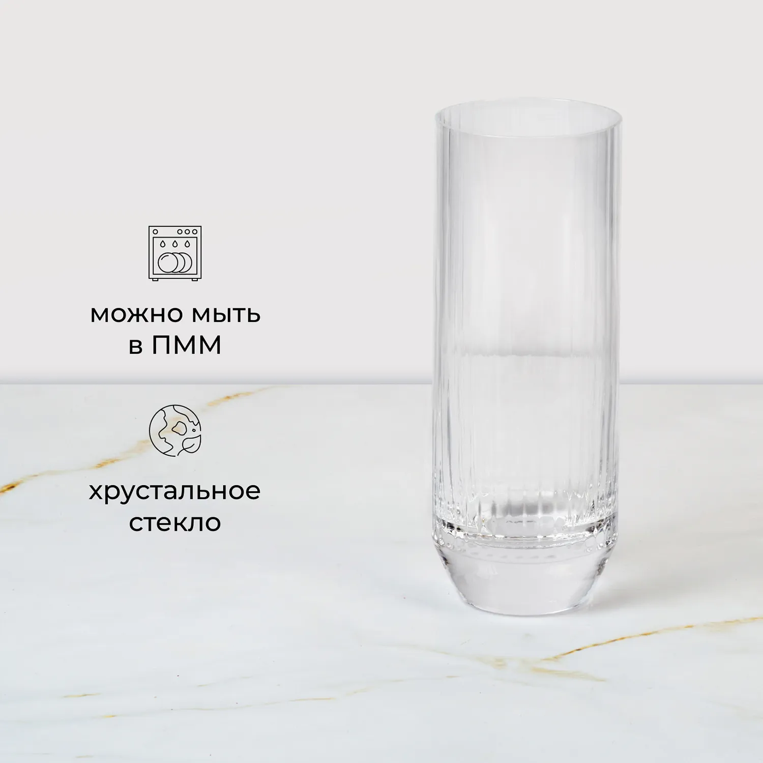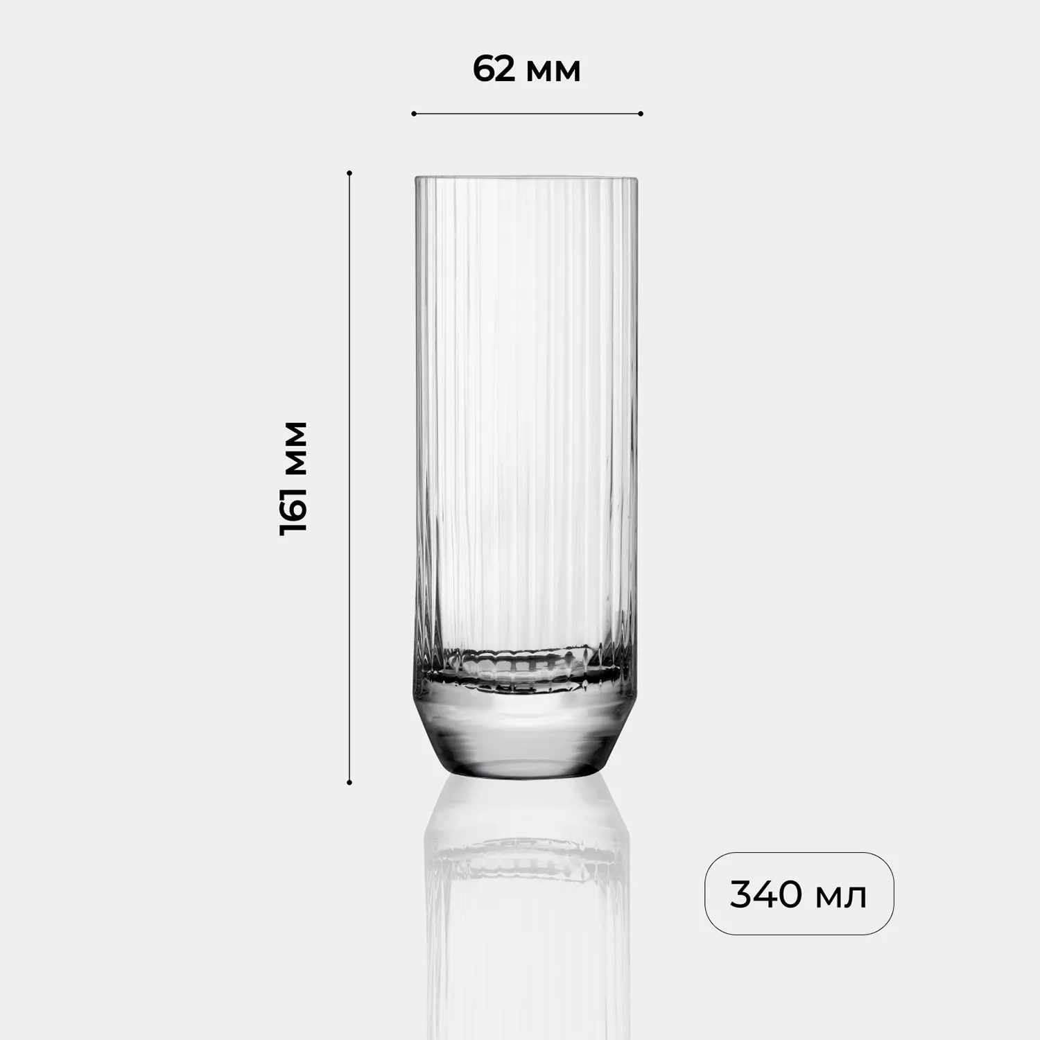 Хайбол полностью прозрачный с легким налетом матовости на стенках. Материал – хрустальное стекло, что добавляет этой серии благородства. Высота стенок 161 мм, диаметр 6,2 см. Объем посуды равен 340 мл.