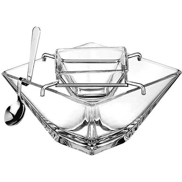 Выполнен из стекла. Состоит из трех предметов, каждый из которых создан с учетом удобства и эстетики. Верхняя чаша предназначена для размещений икры. Подставка под ней удерживает чашу и вмещает лед для охлаждения поданного деликатеса. Третий предмет – ложка со специфической формой. Создана из нейтрального материала, который помогает избежать искажения вкуса даже премиальных сортов.