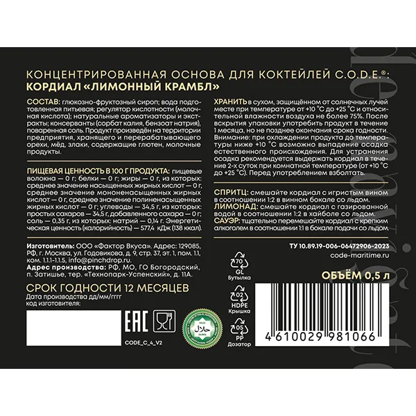 Кордиал «Лимонный Крамбл» C.O.D.E щедро приправлен приятной кислинкой лимона. Это не просто цитрусовая свежесть, это сочетание нежного песочного десерта с нотками немного горьковатой цедры и яркими брызгами лимонного сока.