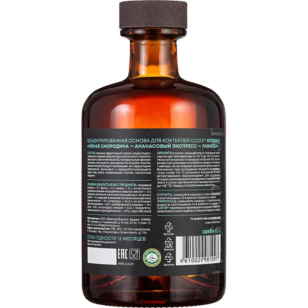 Кордиал «Черная Смородина / Ананасовый Экспресс / Лаванда» – это еще одно неожиданное сочетание вкусов в линейке сиропов от code. Продукт удивляет оригинальными нотами, так как в его букете переплетаются глубокий сладкий и сочный вкус тропического ананаса, который плавно переходит в кисловатые ноты смородинового листа. И все это приправлено ароматным привкусом лаванды.