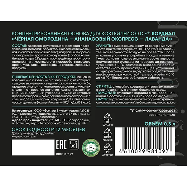 Производитель тщательно подбирает ингредиенты и разрабатывает уникальную рецептуру для создания кордиалов, благодаря чему продукция обладает неповторимым вкусом и ароматом. Ассортимент бренда C.O.D.E регулярно пополняется новыми вкусами, которые сочетают в себе фруктовые, ягодные и пряные оттенки и ароматы. Вдохновением для создания которых, служат впечатления из разных уголков мира.