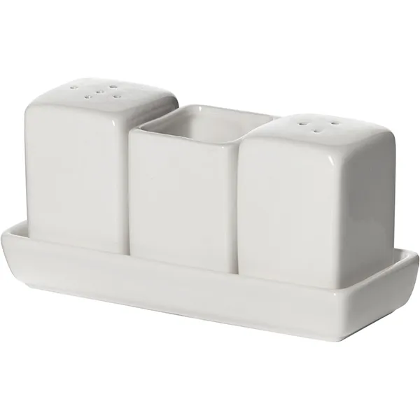 Набор для специй от бренда Кунстверк – это стильный кухонный аксессуар, который пригодиться на каждой кухне. Набор включает три белых предмета – перечница, солонка и подставка для зубочисток. Емкости стоят на небольшом поддоне, это удобно для подачи на стол и хранении. Сделаны из качественного фарфора, стенки устойчивы в появлению сколов и трещин. Глянцевая глазурь не теряет свой первоначальный блеск и не тускнеет со временем. Высота набора 67 мм.