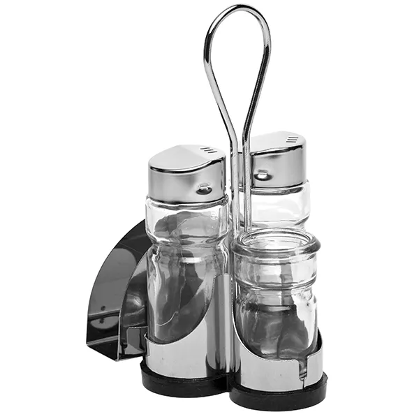 Набор бренда Prohotel включает две емкости объемом 35 мл для соли и перца, а также салфетницу и стакан под зубочистки. Все элементы размещены на металлической подставке из нержавеющей стали с хромированным покрытием, что обеспечивает устойчивость на поверхности и долговечность. Размеры компактные: 155х95х75 мм – набор не занимает много места на столе.