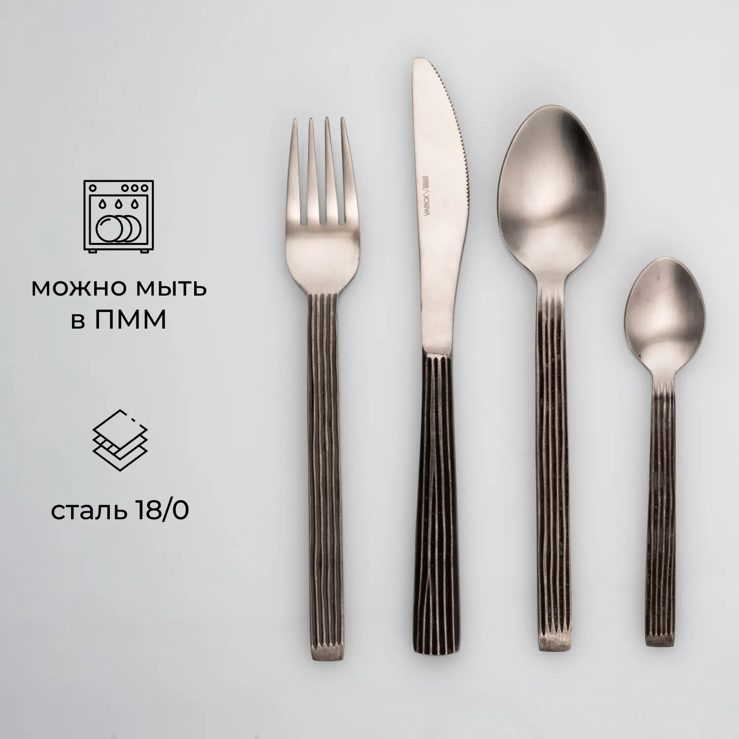 Набор столовых приборов «Дистрест» выполнен из высококачественной нержавеющей стали, что обеспечивает его долговечность и устойчивость к коррозии. Матовое покрытие придает набору элегантный и современный вид, гармонично вписывающийся в любой интерьер. Необычный дизайн приборов добавляет изысканности и подчеркивает качество материалов.