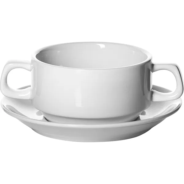 Бренд «Кунстверк» из Китая известен своей фарфоровой посудой. В этой стране знают, как сделать прочный и красивый материал. Пример тому – бульонная пара серии Kunstwerk. Это невысокая емкость цилиндрической формы с двумя ручками. Ее объем 300 мл, высота 60 мм, диаметр 105 мм. К ней дополнением идет блюдце. Оба предмета белого цвета, имеют гладкую поверхность без декора.