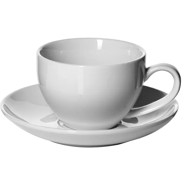 Набор состоит из чашки и блюдца. Объем кружки 200 мл, высота ее 70 мм, а диаметр по верху 88 мм. У блюдца идеальная ровная форма, диаметр равен 140 мм. Товар в белом цвете выполнен из качественного фарфора. Материал красивый сам по себе, поэтому чайная пара не дополнена декорами, чтобы не испортить общее впечатление о дизайне сервиза.