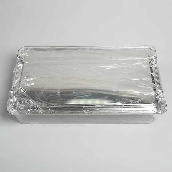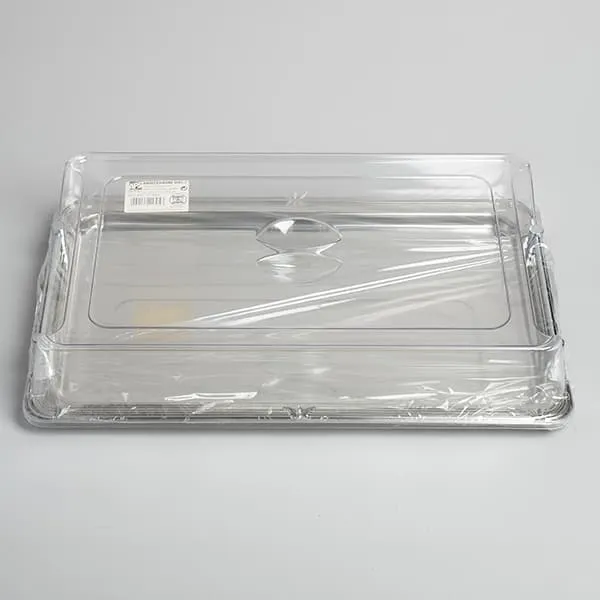 Поднос фуршетный прямоуг. с крыш. уцененный пластик,сталь нерж. ,H=13,L=53,B=32,5см прозр.,металлич.