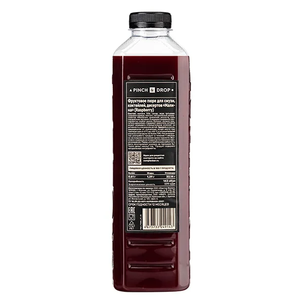 Пюре «Малина» бренда Pinch&Drop – это универсальный ингредиент, который можно использовать в десертах и напитках. Бутылка объемом 1 литр из прозрачного пластика позволяет видеть насыщенный темно-красный цвет содержимого.