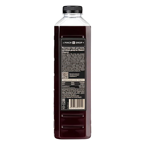 Фруктовое пюре от Pinch & Drop – это концентрированный вишневый вкус с приятной сладостью. Масса имеет густую консистенцию, насыщенный темно-красный цвет и выраженный аромат. В составе сиропа натуральные ароматизаторы и загустители (пектин, камеди). Продукт поставляется в бутылке из пластика объемом 1 литр. Такая тара легче стеклянной, не бьется. В ней удобно хранить и дозировать.
