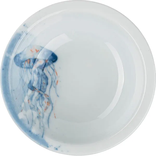 Изысканный салатник «Тренд» от «Добрушского фарфорового завода» изготовлен из фарфора и украшен рисунком медузы в нежно-голубых тонах. Словно акварельный этюд он плавно растекается по белой поверхности. Морской мотив придает изделию оригинальности, при этом гармонично сочетается с классической круглой формой и плавными линиями бортов.