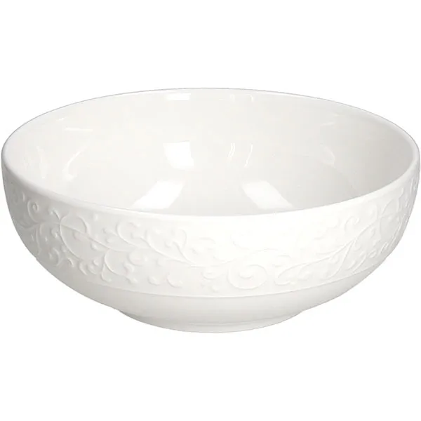 Салатник «Жасмин» бренда Tognana выполнен из прочного белого фарфора, в классической округлой форме с плавно поднимающимися стенками. Верхняя часть украшена рельефными узорами в виде завитков и листьев, создающими впечатление ручной работы. Такой дизайн добавляет утонченности в сервировку.