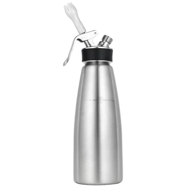 Колба и головка сделаны из нержавеющей стали – это прочный и долговечный материал, который не окисляется и не деформируется. В комплект входит специальная насадка для фигурной подачи сливок. Пластиковая ручка не скользит в руке. Объем – 1 л.