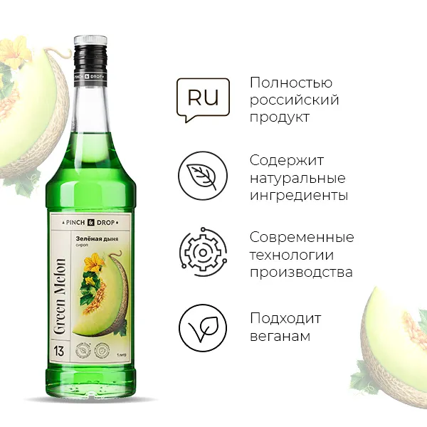 Сироп «Зеленая дыня» привлекает отличным вкусом сочной спелой дыни. Он подойдет для создания десертов, коктейлей и салатов.