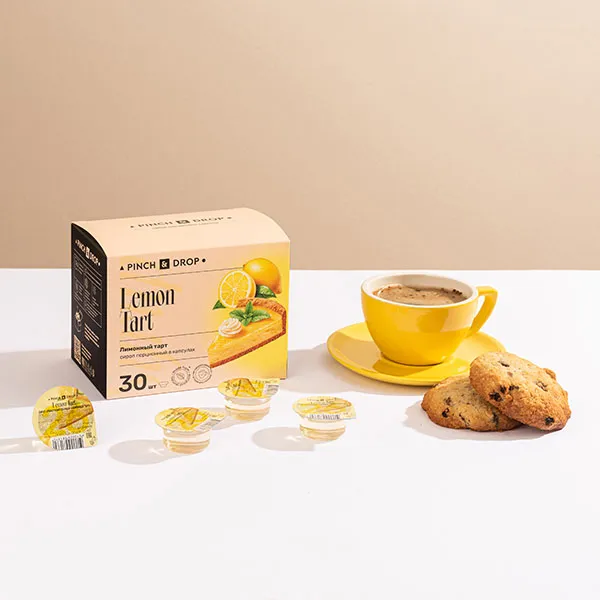 Сироп «Лимонный Тарт» соединяет одновременно кислые ноты лимона, сладость выпечки и пряности, которые характерны для этого блюда. Он очень вкусный и нежный, потрясающие нотки сливок и сгущенного молока дополняют финальные аккорды.