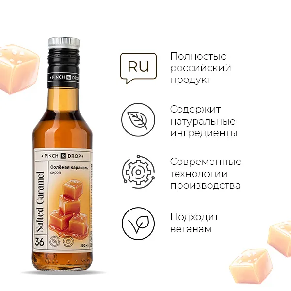 Производитель использует только натуральные компоненты. Производство ведется в соответствии с отечественными стандартами. В итоге клиенты получают великолепный товар с насыщенным вкусом и потрясающим ароматом. Pinch&Drop работает для того, чтобы ваши любимые напитки, десерты и кофе раскрывались новыми вкусами.