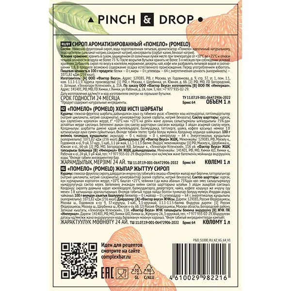 Сироп «Помело» Pinch&Drop стекло 1л D=85,H=330мм белый