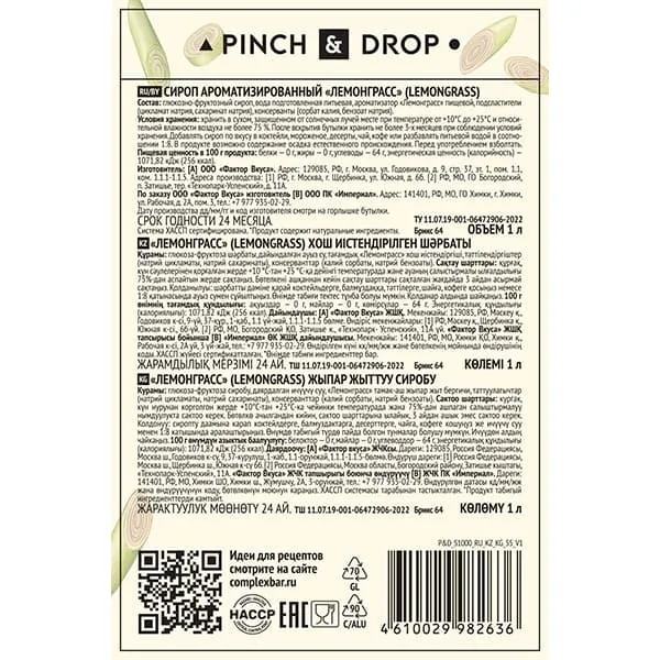 Сироп «Лемонграсс» Pinch&Drop стекло 1л D=85,H=330мм