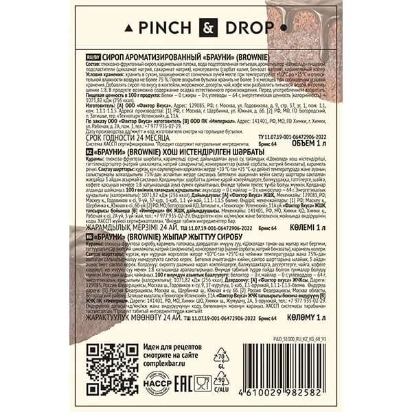 Сироп «Брауни» от Pinch&Drop – воплощение богатого вкуса. Продукт представлен в стильной бутылке из прозрачного стекла объемом 1 литр. Пластиковая крышка с резьбой обеспечивает надежное закрытие, сохраняя свежесть и аромат сиропа.