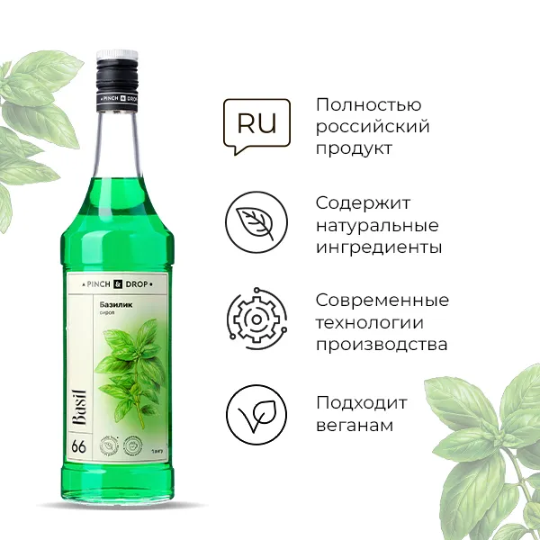 Глюкозно-фруктозный сироп, карамельная патока, вода подготовленная питьевая, ароматизатор «Базилик» натуральный, подсластители (цикламат натрия, сахаринат натрия), консерванты (сорбат калия, бензоат натрия), натуральный краситель Хлорофиллин.