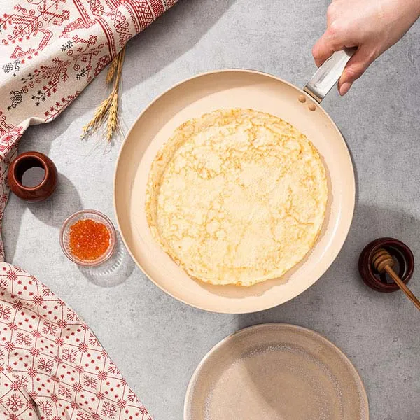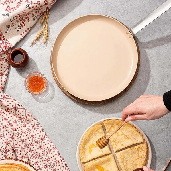 Сковорода для блинов алюмин.,керамика D=28,H=2,L=49см коричнев.,бежев.