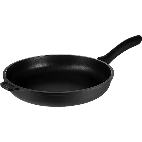 Стальная часть и пластиковая ручка выполнены в черном цвете, который придает изделию стильный вид, делая его органичной частью кухни. Эргономичная ручка комфортно ложится в руку, не нагревается, обеспечивая безопасное манипулирование сковородой во время готовки.