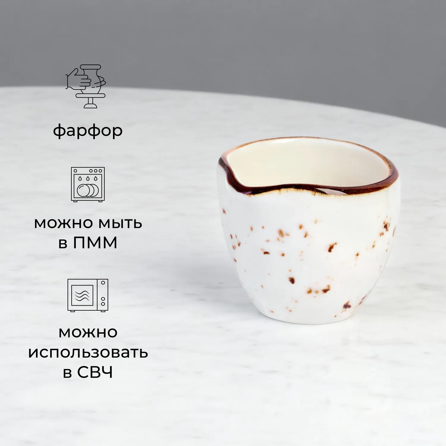 Соусник «Париж» бренда Kunstwerk сочетает эстетику ручной работы с непревзойденной функциональностью. Модель отличается утонченным кремово-белым фоном с шоколадно-коричневыми акцентами и плавным расширением кверху. Продуманная конструкция с миниатюрным носиком обеспечивает аккуратное наливание соусов без капель и разводов.