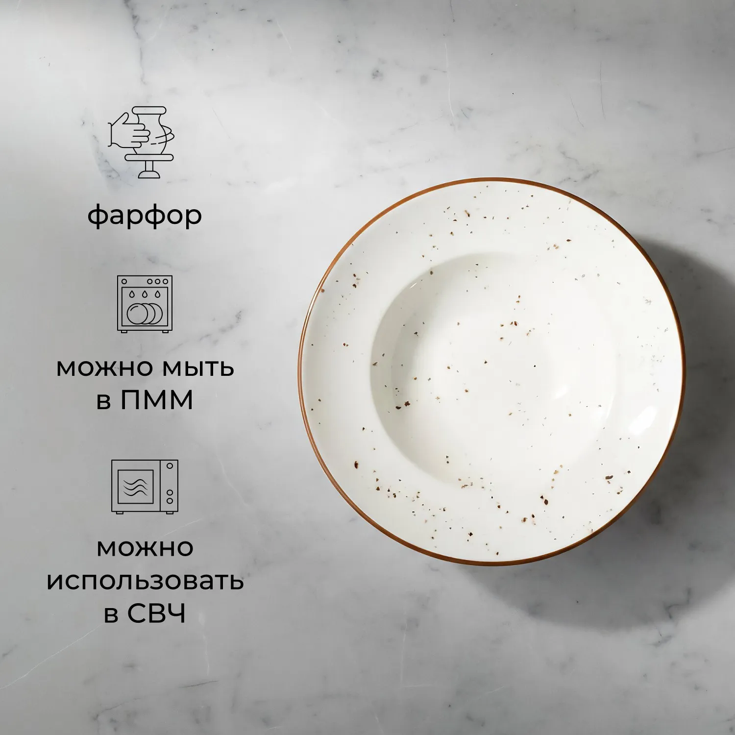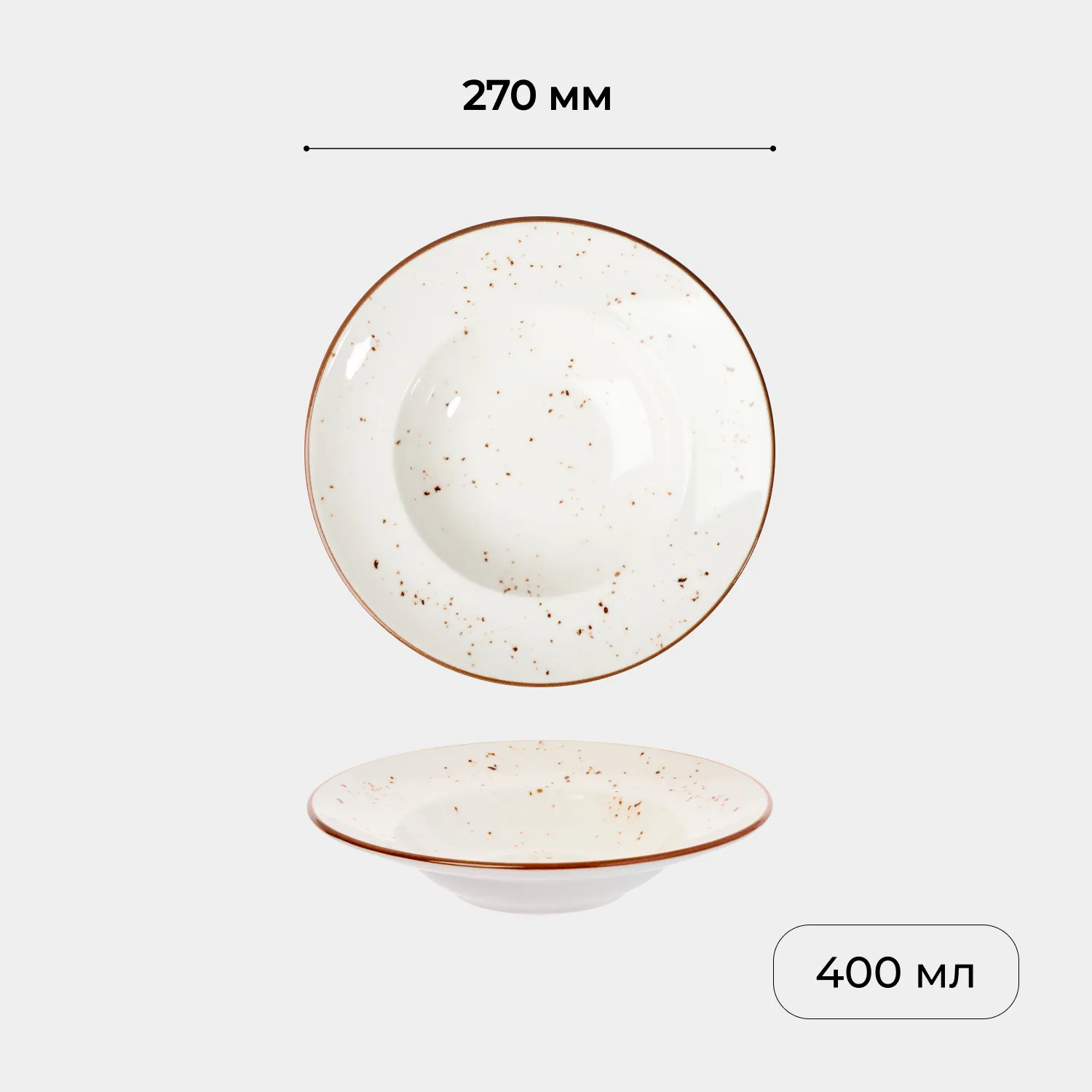 Классический сливочно-белый цвет с деликатным коричневым кантом и натуральными крапинками придает изделию теплый, уютный характер. Диаметр 27 см и объем 400 мл делают эту тарелку идеальной для подачи пасты и других блюд с соусом.