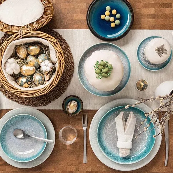 Белая поверхность и нежный бирюзовый цвет в окантовке – стильное и приятное сочетание. Оригинальности дизайну также добавляет хаотичный узор и глянцевая поверхность. Такая посуда вносит свежесть в обыденную сервировку стола, украшает общую обстановку.