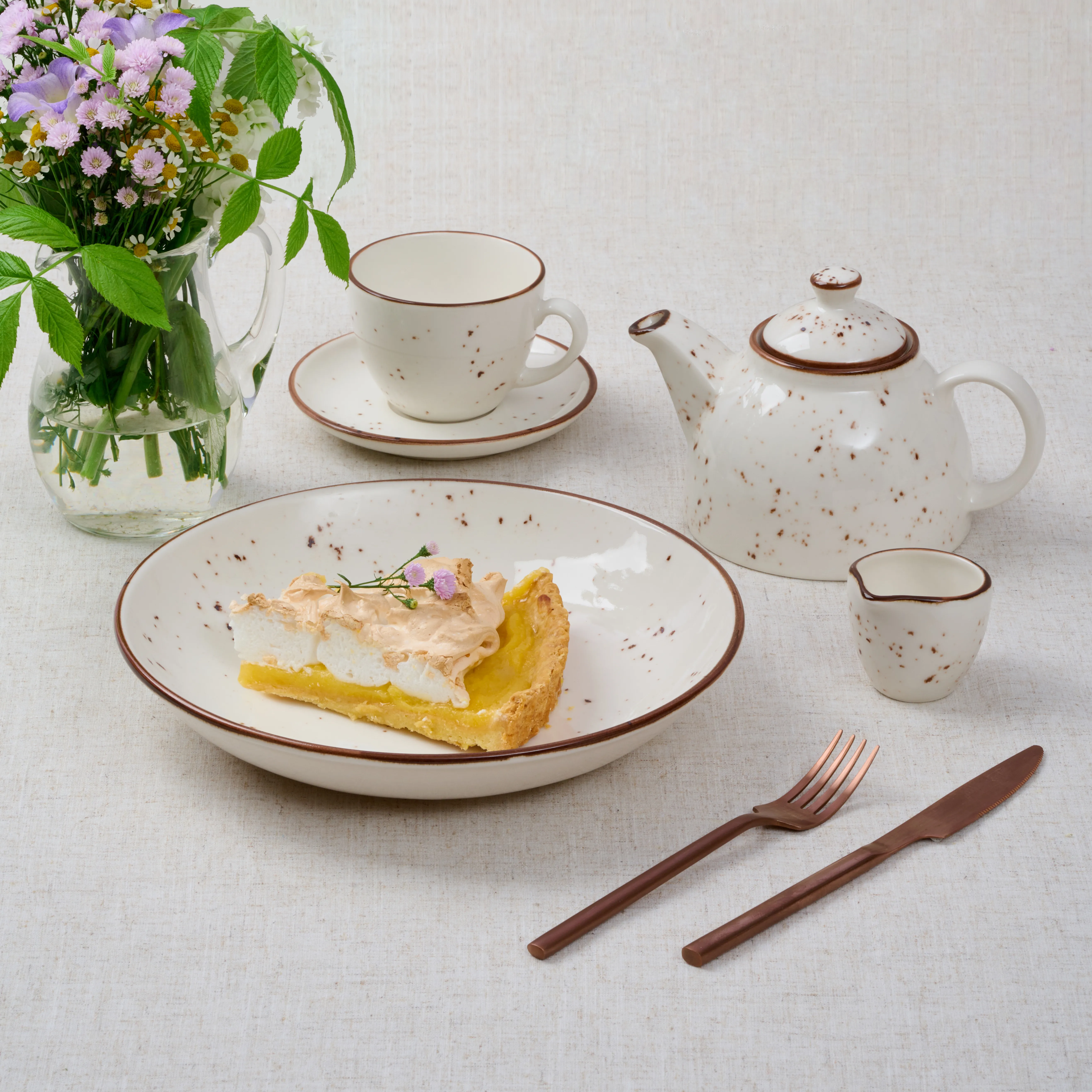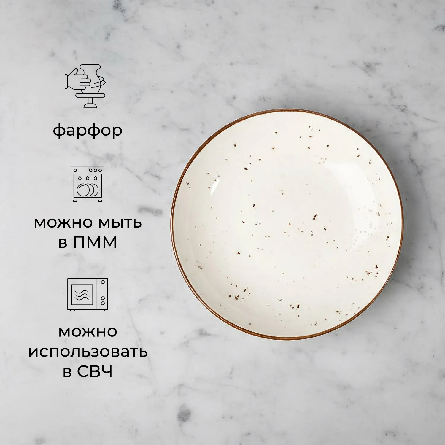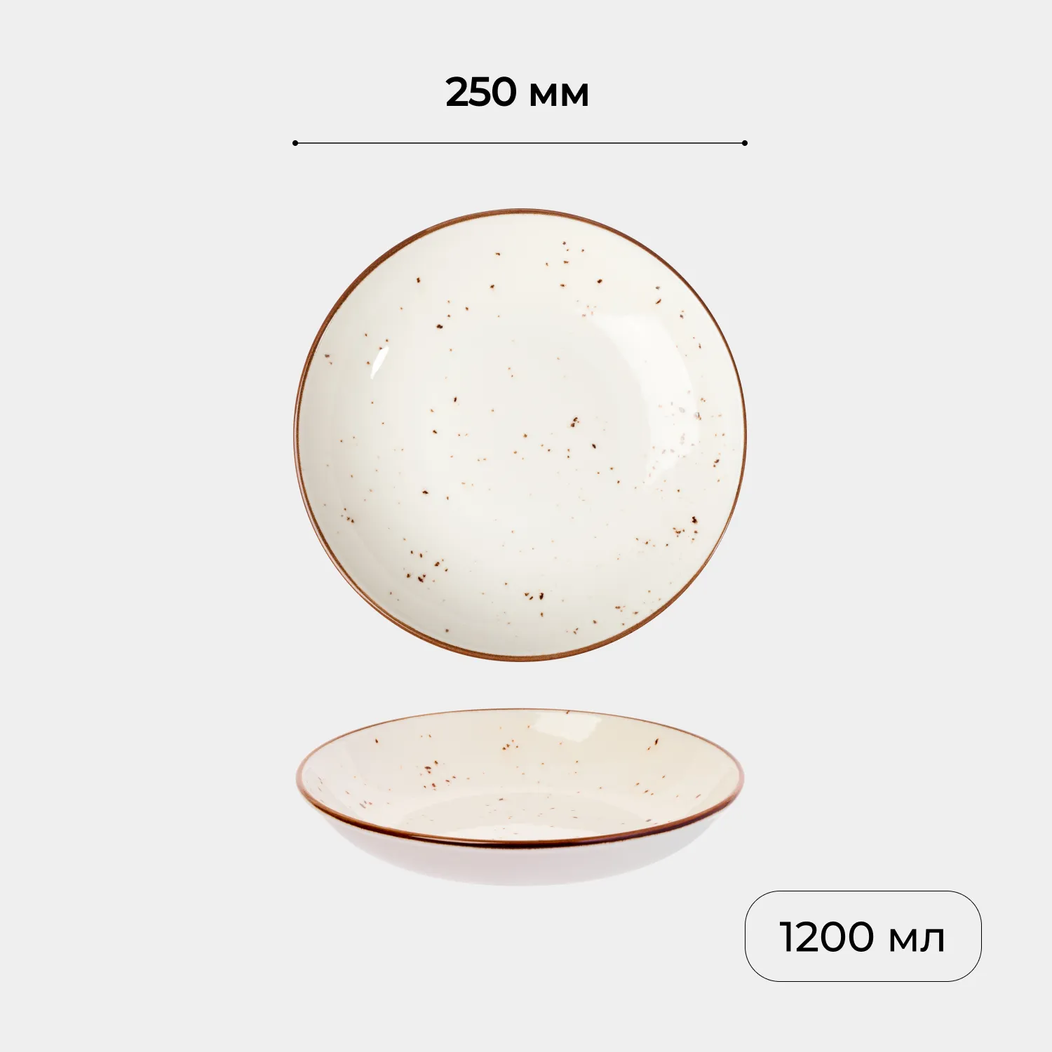 Нежно-белый цвет с мягким коричневым кантом и деликатными вкраплениями придает коллекции характер ручной работы. Диаметр 25 см и объем 1,2 л делают эту посуду вместительным решением для подачи блюд.
