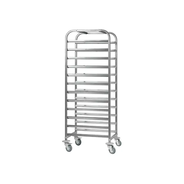 Тележка имеет 12 уровней для размещения противней. Удобные ограничители и безопасные гибы направляющих гарантируют надежное удержание противней. Поворотные колесные опоры диаметром 100 мм, выполненные из серой резины и оснащенные защитными бамперами от ударов, обеспечивают высокую мобильность и безопасную эксплуатацию изделия. В комплект входит весь необходимый для сбора крепеж.