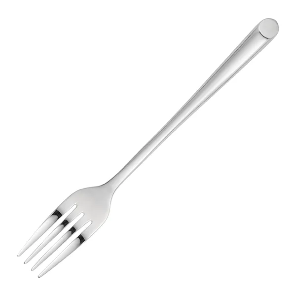 Ручка слегка сужается к концу и завершается округлым плоским завершением, создавая гармоничный баланс и подчеркивая эргономику изделия. Верхняя часть вилки состоит из четырех заостренных зубцов, что облегчает прокалывание пищи.
